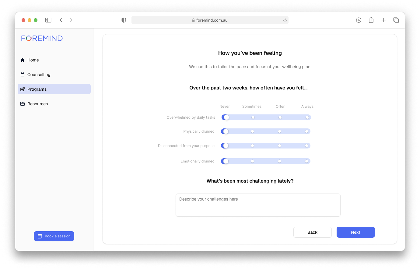 Foremind’s cutting-edge tools give you real-time visibility, helping you track workplace stressors to meet compliance standards - minimising risk and creating a healthier, safer team culture.